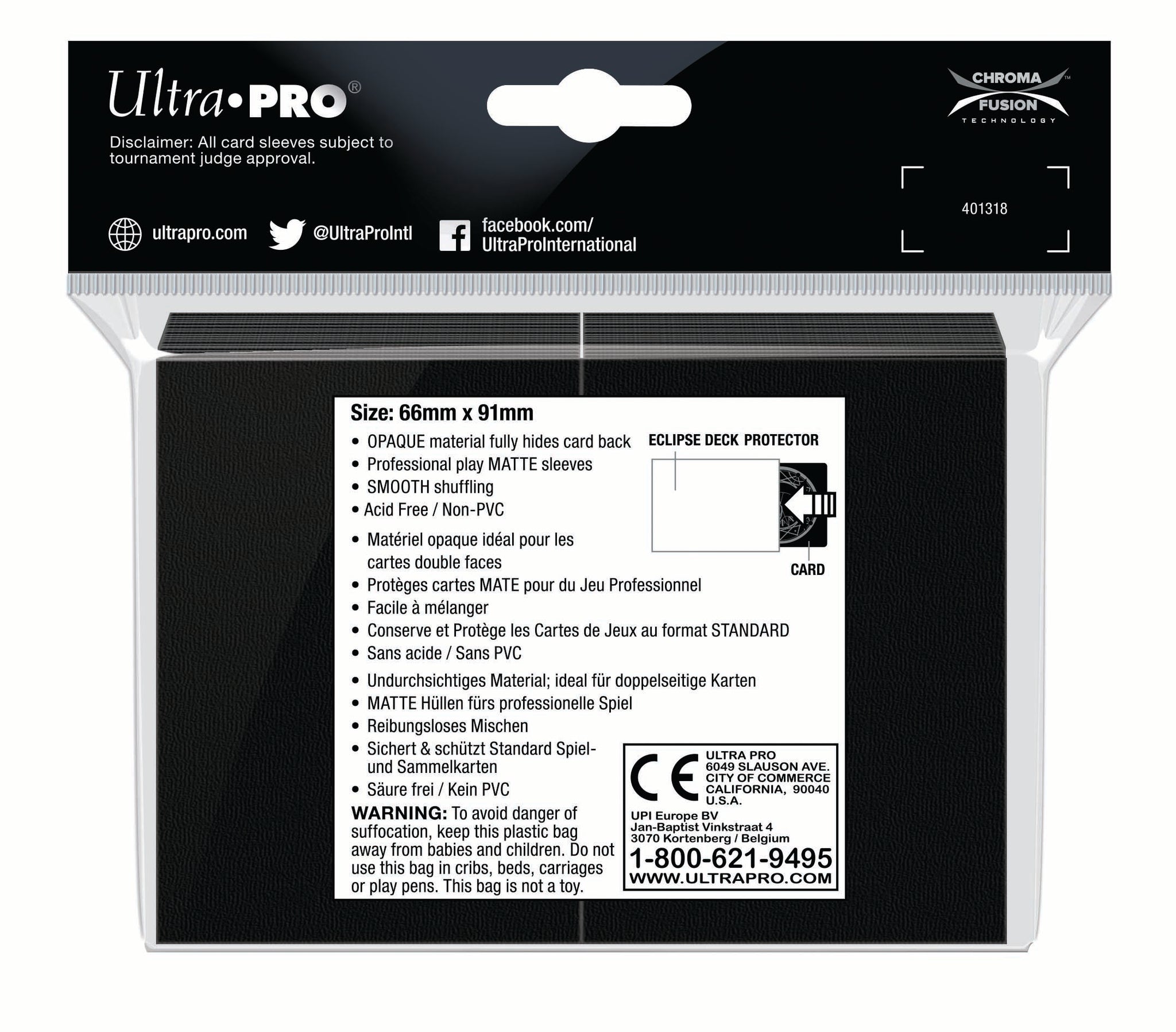 The Eclipse Matte Deck Protector sleeves offer a fully opaque back and glare-free matte card display. With the help of ChromaFusion technology, these sleeves feature an effortless glide shuffle and split-resistant seal, making Eclipse Deck Protectors premium trading card protection. Each pack includes 100 standard sized card sleeves, hand packed and manufactured in California, USA.